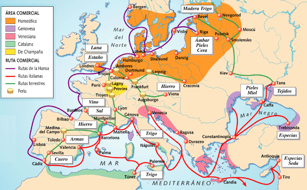 - La primera ruta marítima fue la Mediterráneo que unía Venecia, Génova, Marsella, Barcelona y Valencia con Oriente Próximo y el imperio bizantino. Comerciaban con productos de lujo como la seda y las especias procedentes de Oriente y a cambio les vendían tejidos, armas y herramientas.