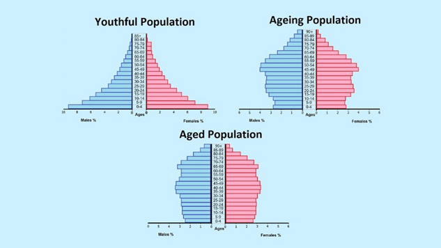 A population pyramid or age pyramid is a graph combining age and sex factors in a population. It is a double chart reflecting age groups both in male and female populations.