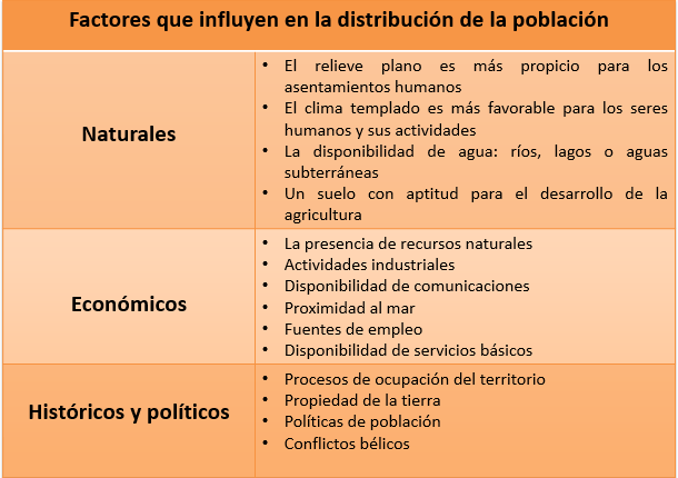 - Factores físicos. La población se concentra en la zona de climas templados y en zonas llanas con buen abastecimiento de agua. En climas extremos la población es mucho menor.
